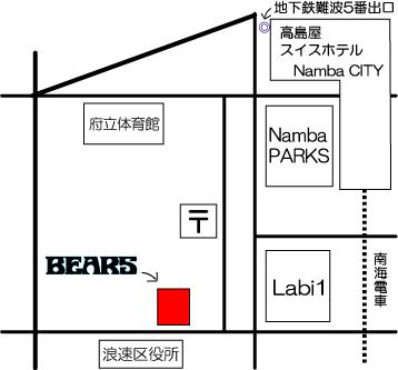 BEARS http://home.att.ne.jp/orange/bears/ 住所:〒556-0011 大阪市浪速区難波中3−14−5 新日本難波ビルB1 電話:06-6649-5564 地下鉄難波駅5番出口を出て、そのまま進行方向にまっすぐ、 信号3つ目を右に曲がったところにあります。 徒歩約8分。阪神高速の高架に沿って歩く感じです。 |