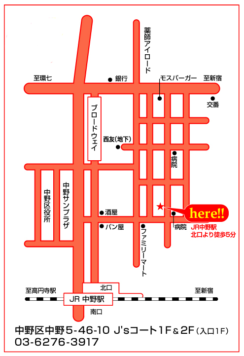 ◆場所 JR中野駅北口徒歩5分 中野区中野5-46-10 nakano”F” (入口は1Fとなります) 03-6276-3917 --*--*--*--*--*--*--*--*--*--*--*--*--*--*--*--*--*--*--*- |