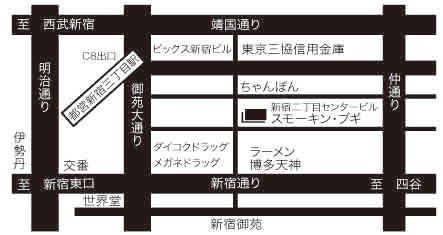 --map ![]() 【JR新宿駅からのアクセス】 東口アルタ方面の出口を出て アルタ前の道(新宿通り)を伊勢丹方面へ 明治通り(伊勢丹角)を越え 御苑大通り(新宿2丁目交差点)を渡り メガネドラッグと花屋の角を左に入る その路地の右側に看板がある 【新宿三丁目駅からのアクセス(都営新宿線.丸の内線)】 地下道のC8出口 C8出口はBYGSビルというショッピングビルなのでエスカレーターで地上一階にあがる 正面出口を出ると大通り(御苑大通り)に面するので通りを左に 牛丼屋を通り過ぎ インドカレー屋の角を左に曲がる 次の長崎ちゃんぽん屋がある角を曲がると 左手にスモーキンブギの看板があります |