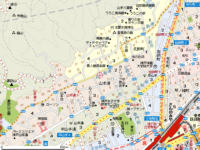 三宮駅から北へ、徒歩約15分。
