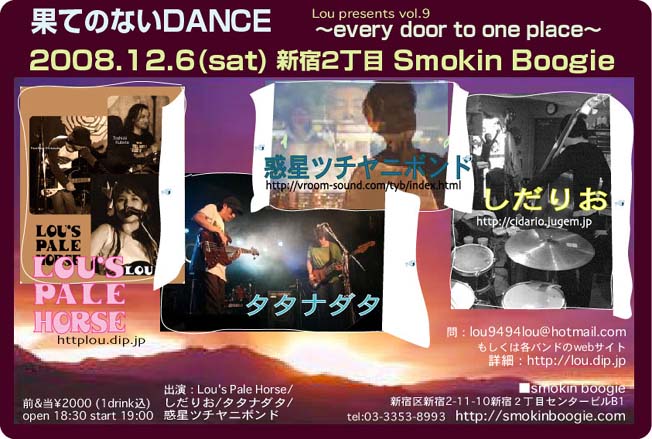 LOU presents 『果てのないDANCE』 vol.9 〜 every door to one place 〜 2008.12.6(土) 新宿2丁目 Smokin Boogie LOU企画イベント『果てのないDANCE』9回目となります。 初アルバムを製作中で、オルタナ色が強まってきている、久しぶり登場のしだりお。 最近路上活動をご一緒している佐藤君のバンド、タタナダタは、ツインベースとドラムの3ピース。 環境系インストゥルメントバンド。 デビューアルバムはXTCやLOVEを思わせる少しひねったポップミュージック、どんどん変遷途中 と思われる、惑星ツチヤニボンド。 そして、LOU'S PALE HORSEは3曲入り マキシアルバム 『「孤独の深夜列車』をプレ発売予定!!! 限定50枚は連番付き&手書きメッセージ付き 3曲いり500円。 是非聴いていただきたい、珠玉の3曲です! 是非お越しください!!!!!! 前/当\2000 (1drink込) open 18:30 start 19:30 !!!!スタート時刻が若干遅くなりました。19:30から演奏開始です! 出演 Band: Lou's Pale Horse しだりお 惑星ツチヤニボンド タタナダタ スモーキンブギ http://www.smokinboogie.com/ 〒160-0022 新宿区新宿2-11-10 新宿2丁目センタービルB1 TEL:03-3353-8993 予約、お問い合わせは lou9494lou@hotmail.com fax:03-6903-9414、またはメンバーに直接にお願いします |