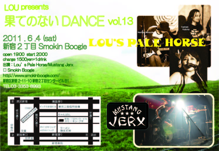 LOU presents 『果てのないDANCE』 vol.13 2011.6.4(土) 新宿2丁目 Smokin Boogie LOU企画イベント『果てのないDANCE』13回目。 博多に移住しているLOUが古巣の新宿スモーキンブギで、古株のPale Horseのメンバーと 2年ぶりのライブをします。震災の影響化、不安をかかえる時期ではありますが、やれることやりたいことを精一杯やりに東京に行きたいと思います。 ファーストアクトに、5月にアメリカツアー、6月頃に新アルバム発表予定で ノリに乗っているMustang Jarxをお迎えし、パワフルにお送りしたいと思います。 もしお越しいただける余裕があれば、ぜひぜひよろしく。お待ちしております! carge 前/当 \1500+1drink open 19:00 start 20:00 出演 Lou's Pale Horse Mustang Jerx スモーキンブギ http://www.smokinboogie.com/ 〒160-0022 新宿区新宿2-11-10 新宿2丁目センタービルB1 TEL:03-3353-8993 予約、お問い合わせは lou9494lou@hotmail.com fax:092-517-0149またはメンバーに直接にお願いします |